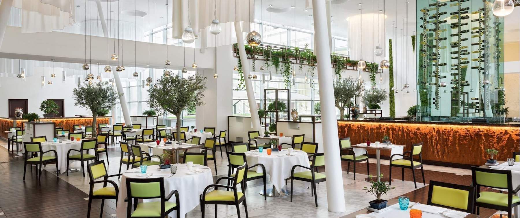 Un ambiente conviviale e luminoso dai vividi colori. Verrete rapiti dalla spettacolare Wine Tower, una torre di vetro alta 6 metri che spicca al centro del ristorante.